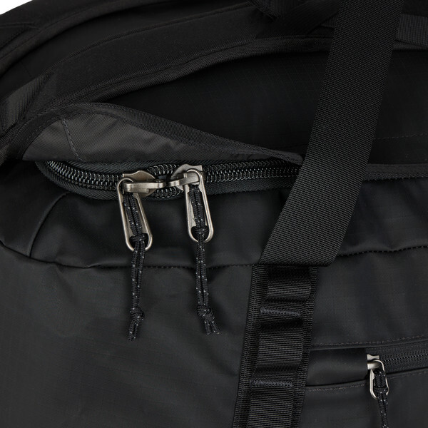 Основной материал устойчивой к истиранию дорожной сумки обладает высокими водоотталкивающими свойствами благодаря покрытию из ТПУ. Основание и боковые стенки дополнительно усилены, а в качестве точек фиксации по всему периметру используются цепочки и ручки.