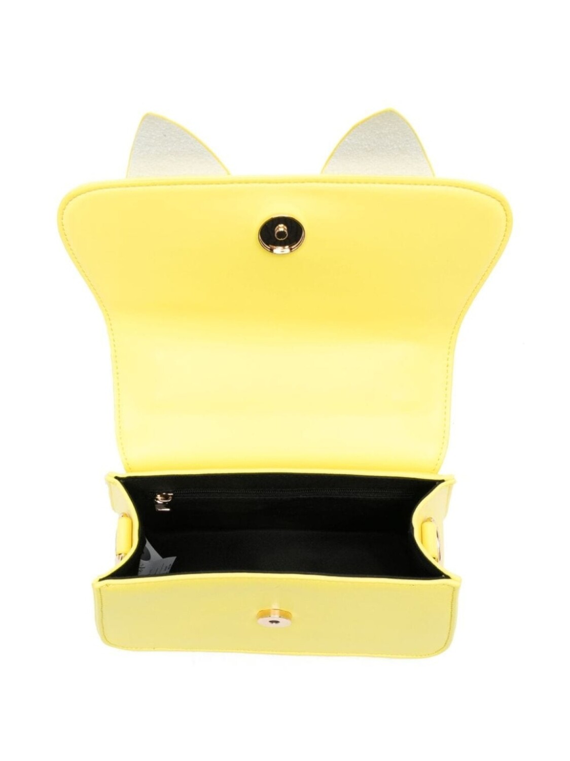 Лимонный, телячья кожа, крупный бант, золотистый логотип, золотистая фурнитура, откидной клапан на магните, съемный цепочный ремень на плечо, ручка с плоским верхом, основное отделение, нашивка с логотипом внутри и внутренний карман на молнии.