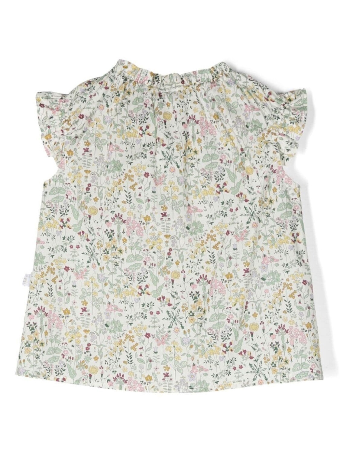 Белый/разноцветный, хлопок, сплошной цветочный принт, воротник с оборками, манжеты с оборками, маленькая подвеска с логотипом, без рукавов и прямой подол.