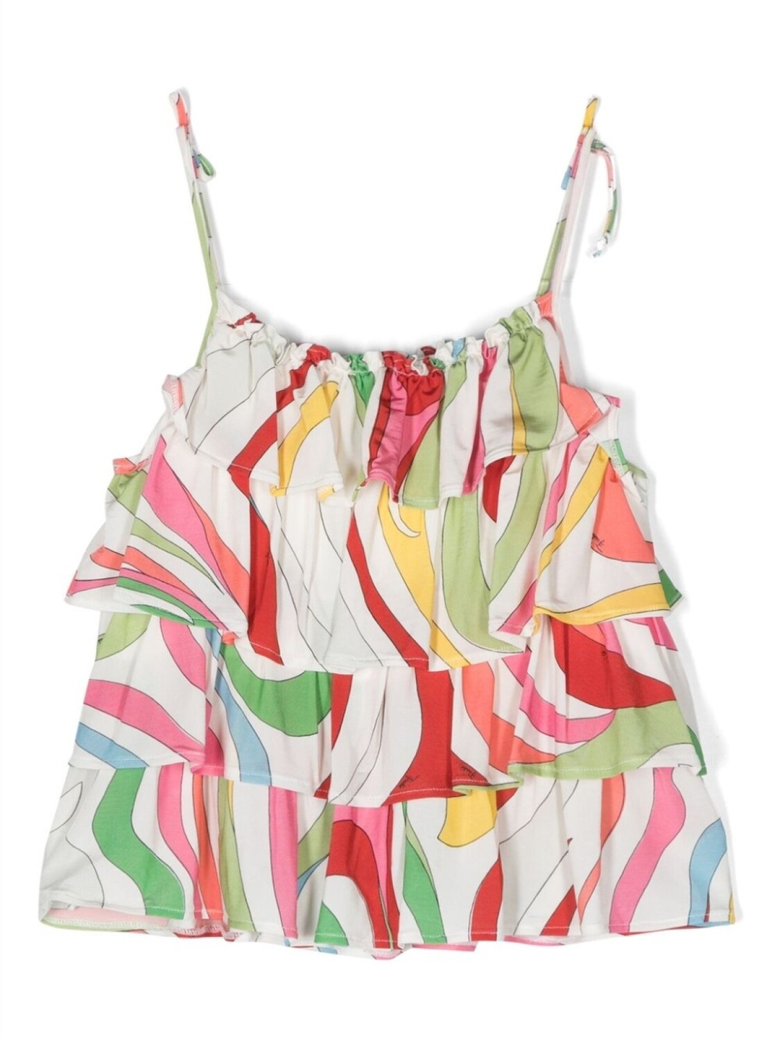 Белый/разноцветный, эластичный материал, сплошной графичный принт, ремешки на завязках, без рукавов и вставки с оборками.