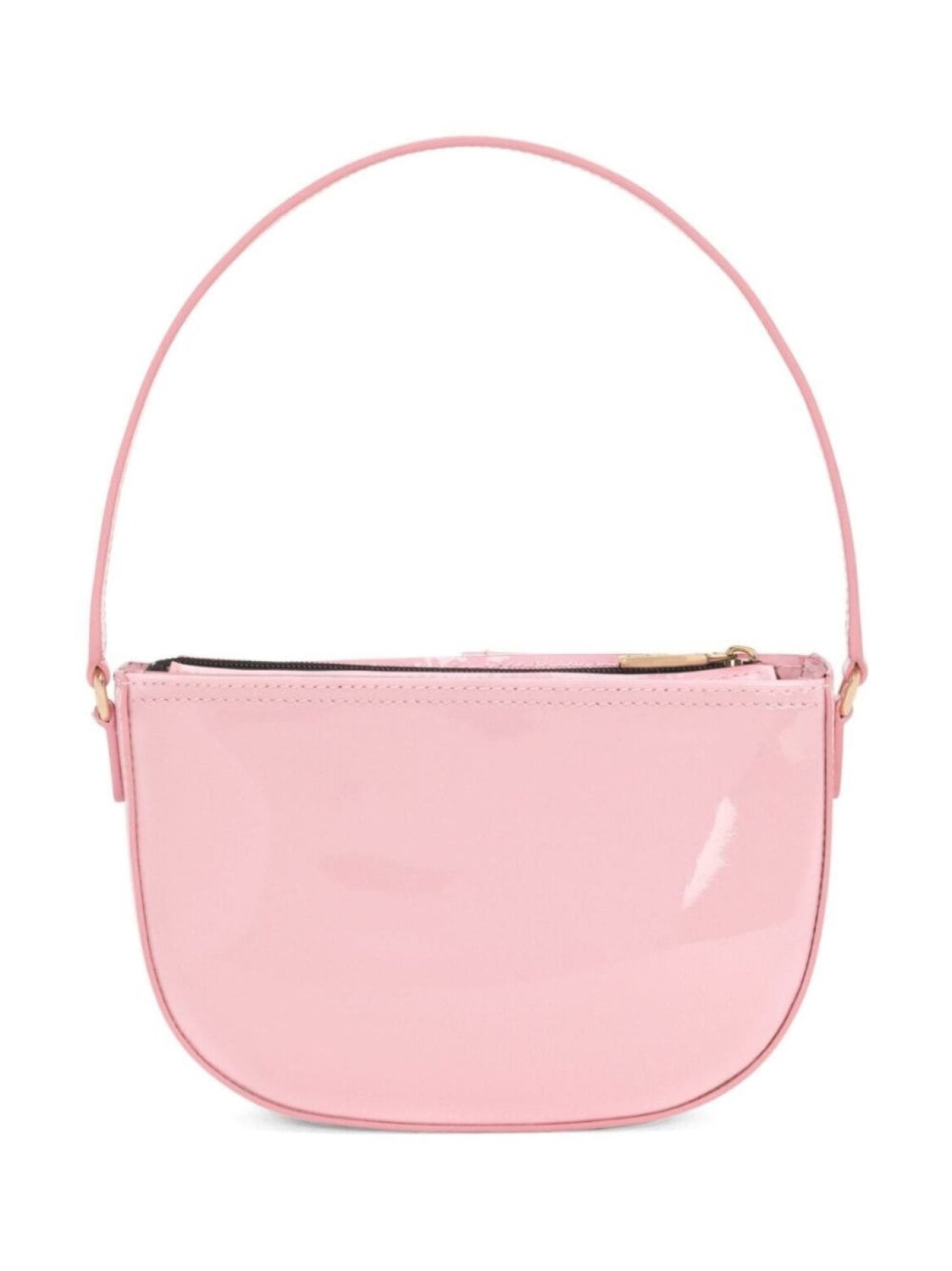 Расцветка Blush Pink, телячья кожа, лакированная отделка, золотистый металлический логотип, нашивка с логотипом спереди, строчка в тон, застежка на молнии сверху, ремень на плечо, два накладных кармана спереди, основное отделение и атласная подкладка.