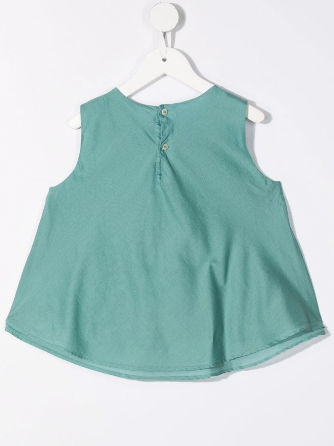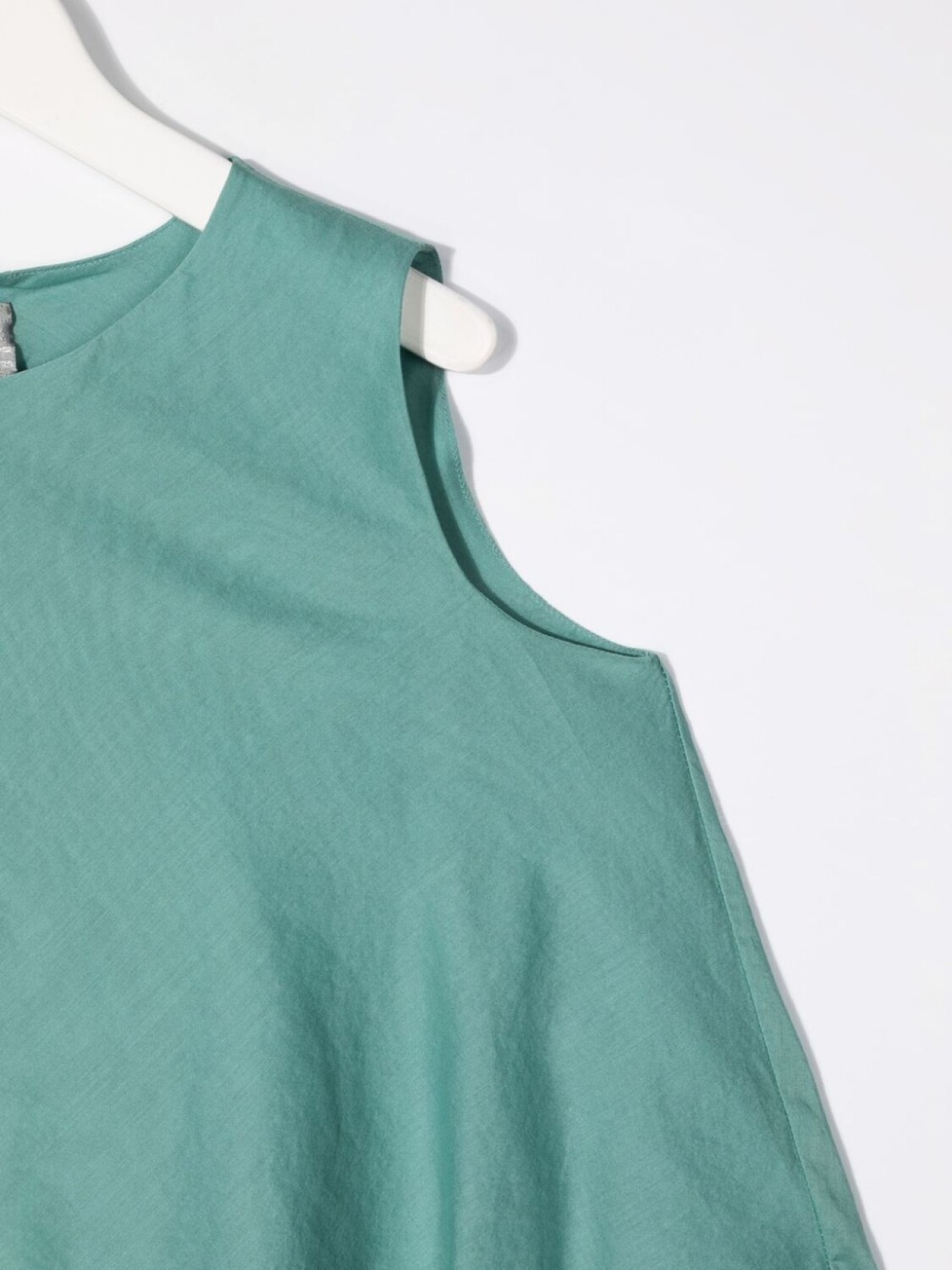 Двухслойный материал, без рукавов, круглый вырез, застежка на пуговицы сзади и закругленный подол. Цвет: зеленый.