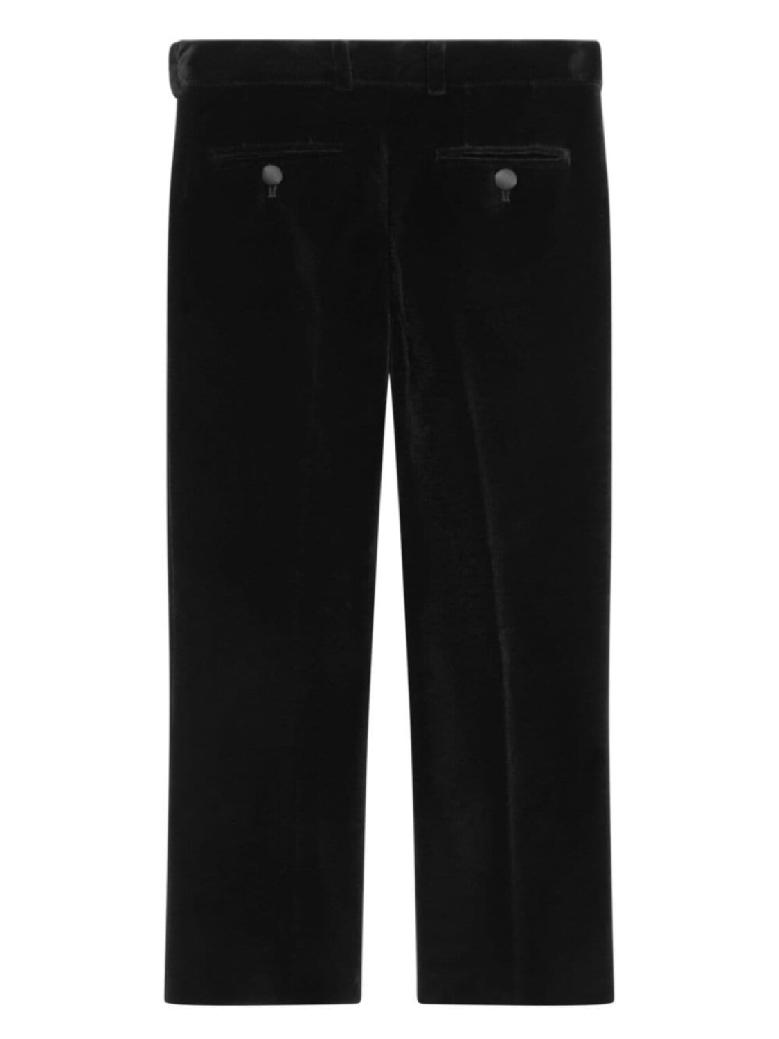 Черный, хлопок, вельветовый материал, петли для ремня, потайная застежка на молнии и пуговицах, два кармана по бокам, два прорезных кармана на пуговицах сзади и прямой крой.