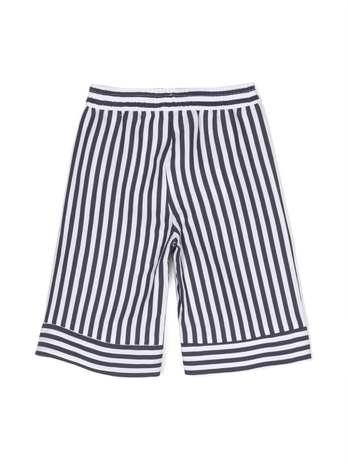Синий/белый, узор в полоску нескольких видов, серебристый металлический логотип, эластичный пояс и широкий крой.