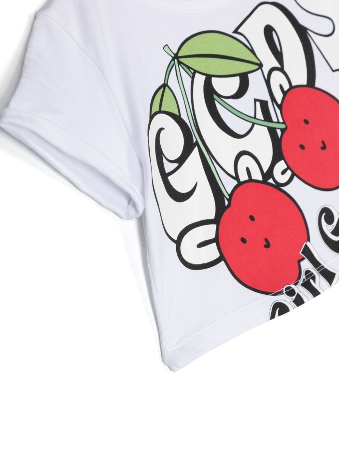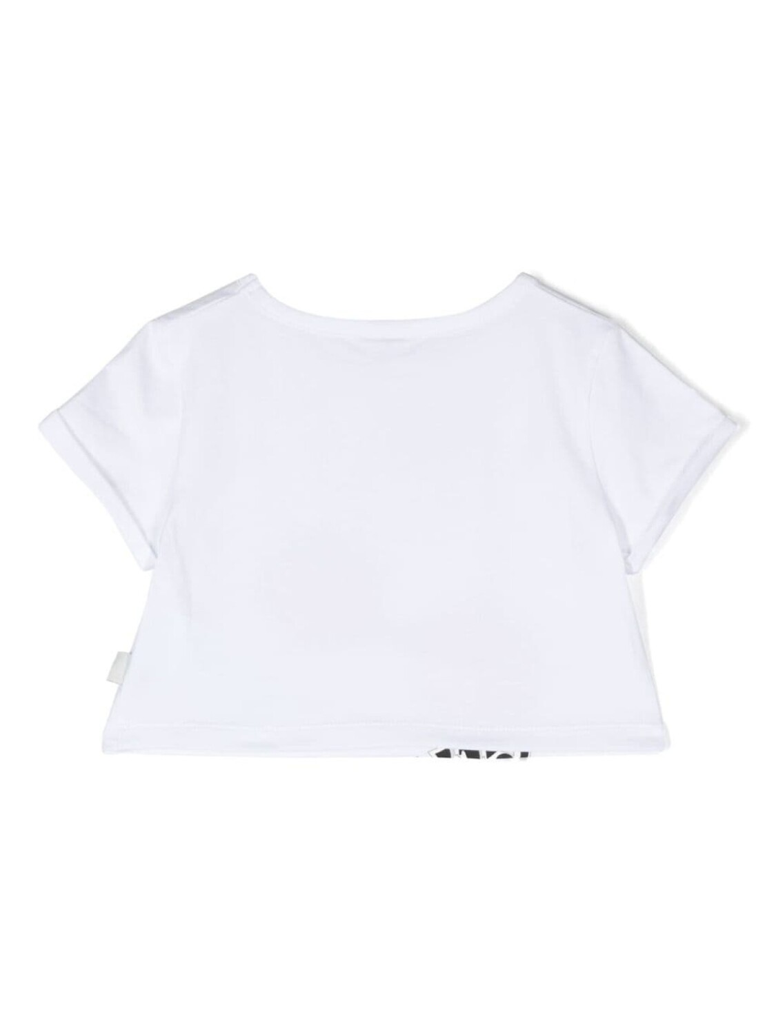 Белый, эластичный хлопок, логотип спереди, графичный принт спереди, круглый вырез, короткие рукава с отворотами и прямой подол.