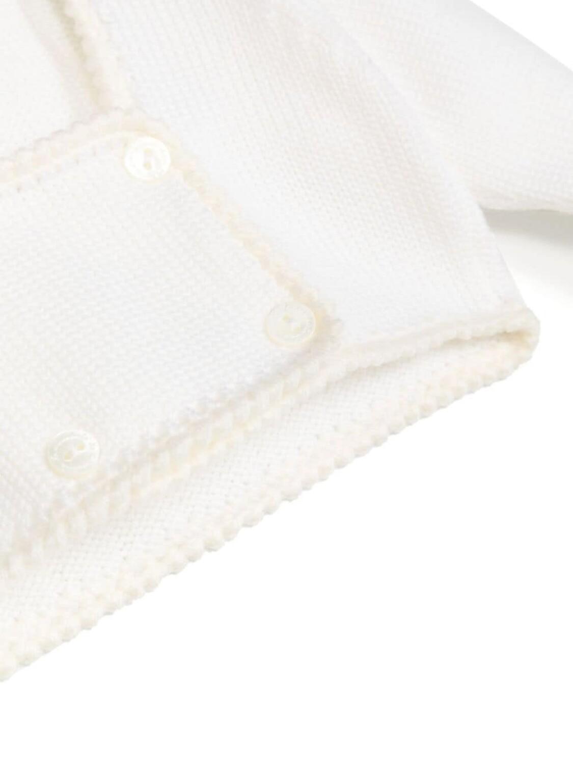 Кремово-белый, смесь шерсти и кашемира, трикотажный материал, контрастная отделка, квадратный вырез, двубортная застежка на кнопки и длинные рукава.
