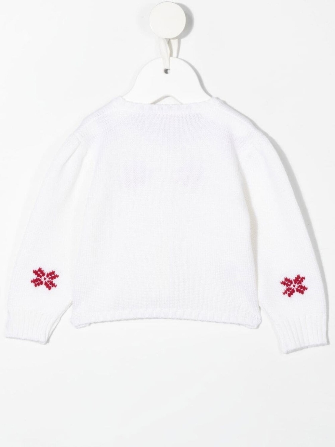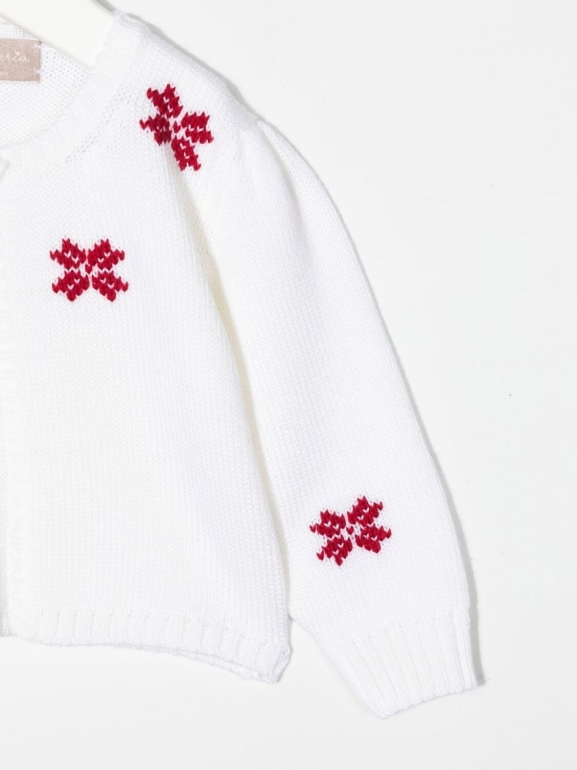 Белый, шерсть, вязка интарсия с цветочным узором, круглый вырез, застежка на пуговицах спереди, длинные рукава и прямой подол.