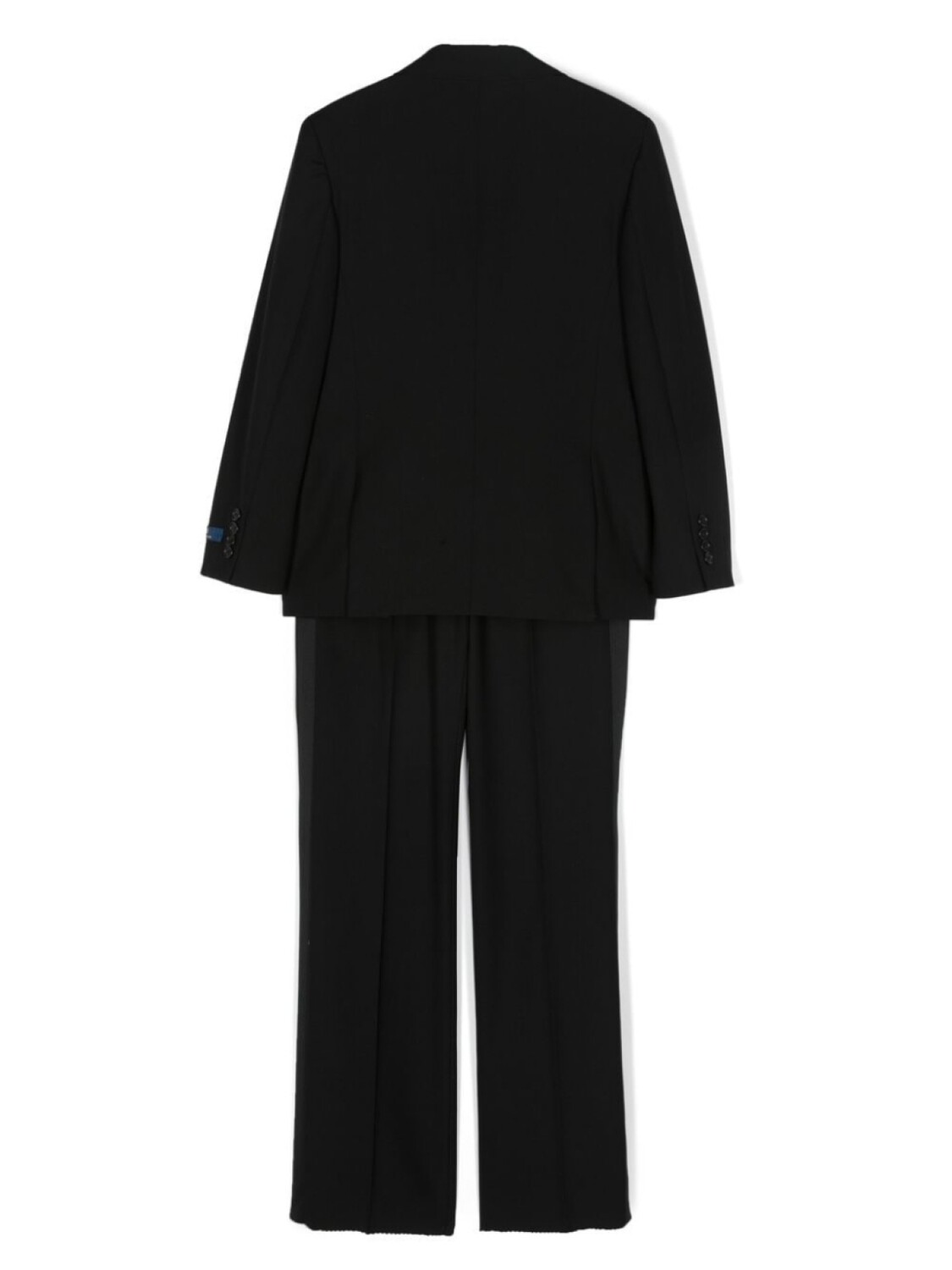 Черный, шерсть, нашивка с логотипом на рукаве, зазубренные лацканы, длинные рукава, прорезной карман на груди, два кармана с клапанами по бокам, две боковые шлицы сзади, застежка на пуговицах спереди, стрелки, потайная застежка спереди и два прорезных кармана по бокам.