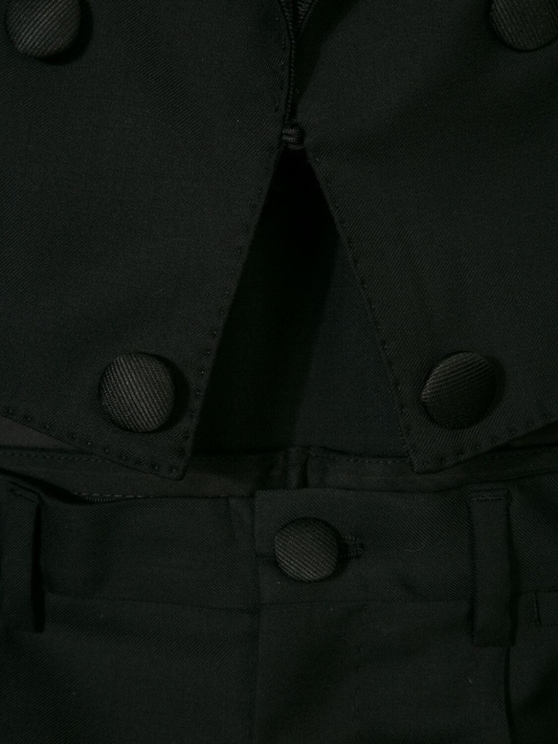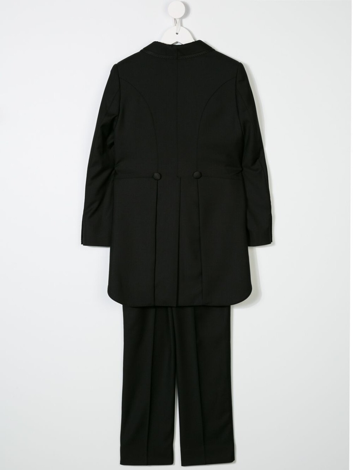 Черный брючный костюм с двубортным пиджаком из микса шерсти и шелка от Dolce & Gabbana Kids. Двубортный фасон, длинные рукава, модель по фигуре, классический воротник, длинные рукава, строгий крой.