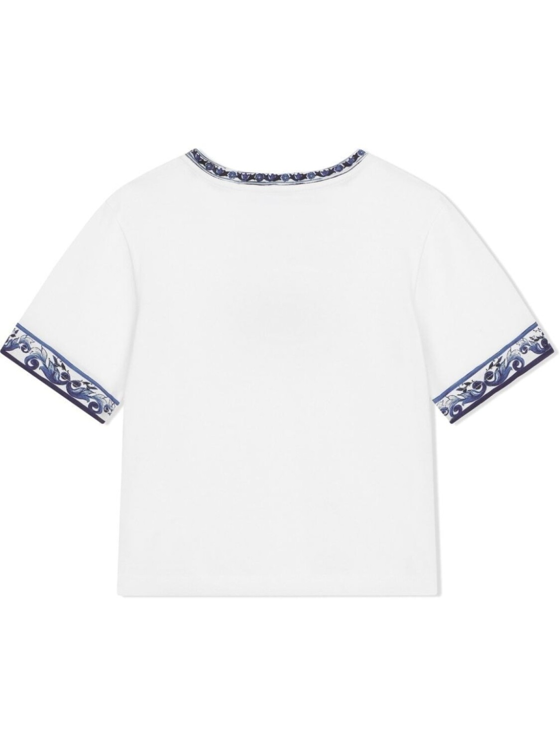 Синий, белый, хлопок, ткань джерси, принт Majolica, логотип спереди, контрастная отделка, круглый вырез, короткие рукава и прямой подол.