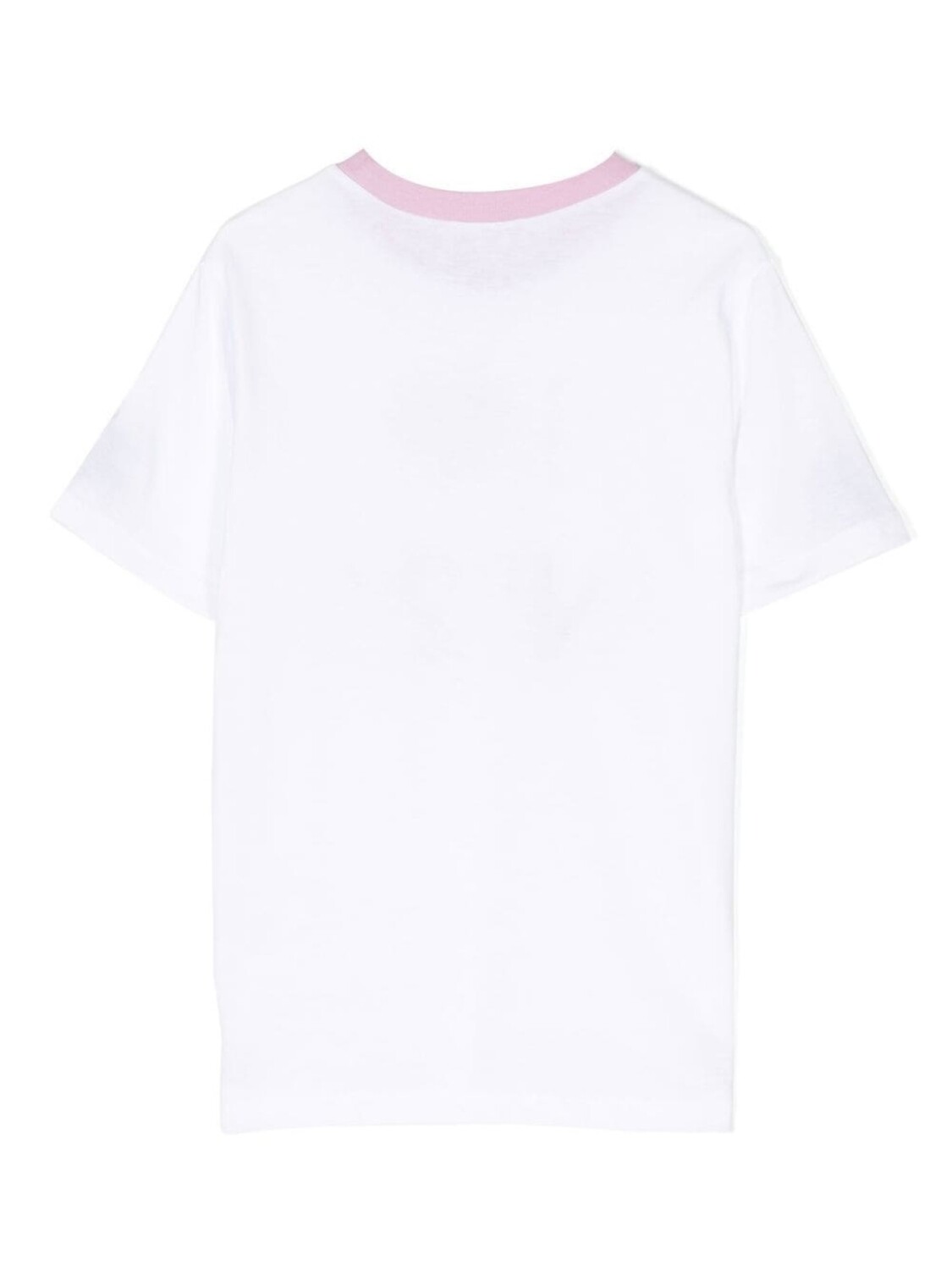 Белый, хлопок, принт с логотипом на груди, круглый вырез, короткие рукава и прямой подол.