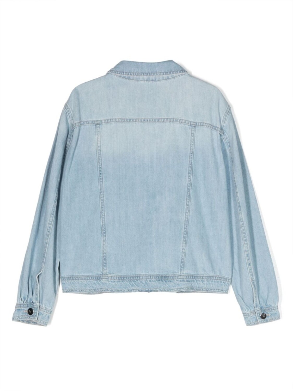 Голубой, хлопок, обработанный деним, классический воротник, застежка на пуговицах спереди, длинные рукава, манжеты на пуговицах, нагрудный карман на двух пуговицах и прямой подол.